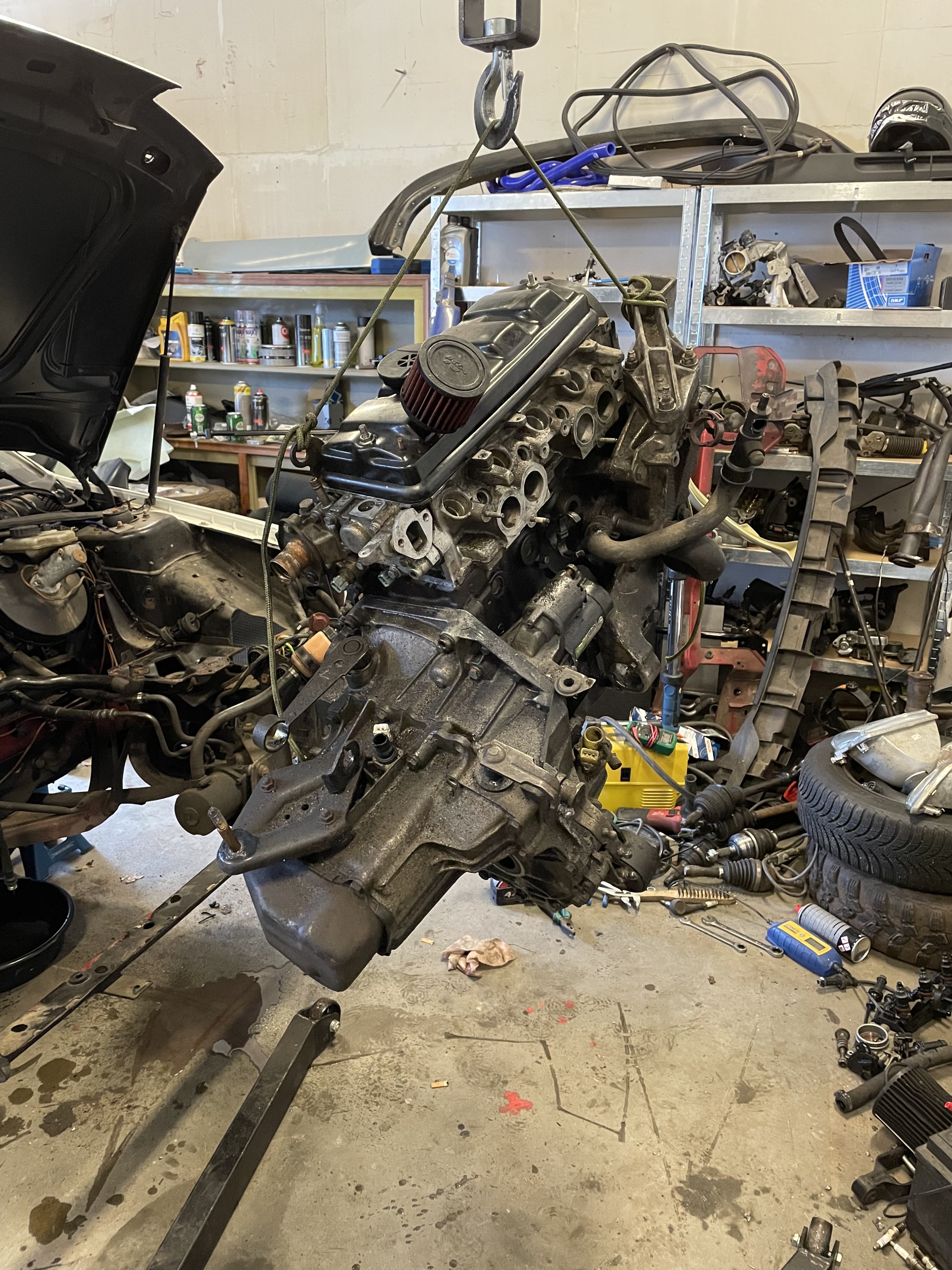 Ook het nieuwe motorblok er alvast in gehangen. Volgende word koel systeem en kabelboom aansluiten.