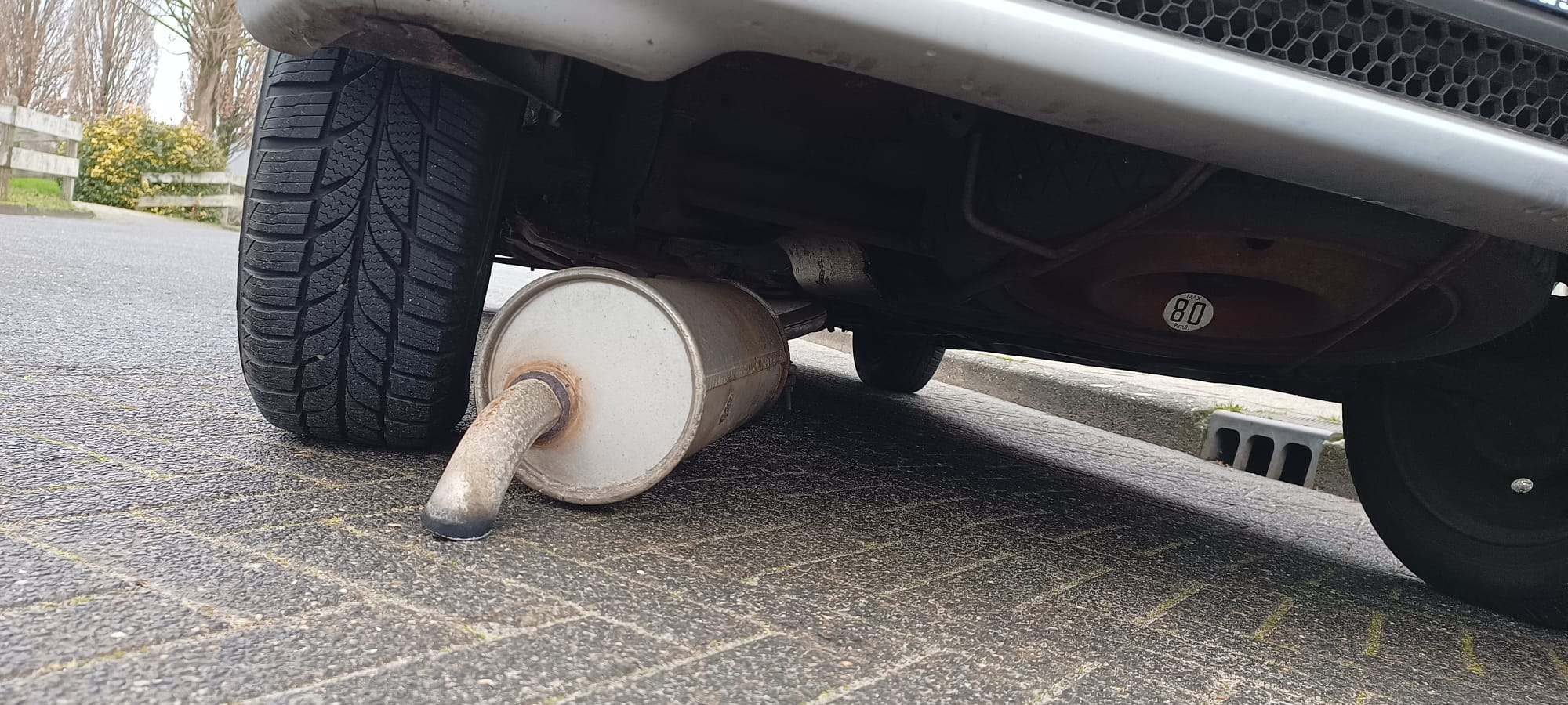 Dus... vanmorgen liep ik naar mijn auto om naar school te gaan, en zag dat mijn uitlaat wat lager hing. beetje gevoeld of hij nog wat stevig hing, en dat ging wel. Dus rij ik weg en na 10 meter hoor ik geschraap. auto gestopt en toen zag ik dit: Bekijk bijlage 7447